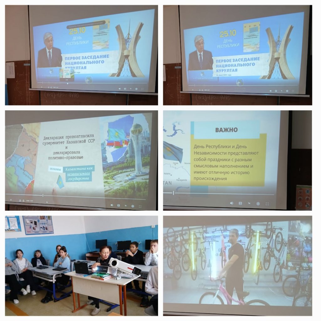 20 қазанда тақырыпта сынып сағаты өтті: Қазақстан Республикасының Күні. Жол қауіпсіздігі. Велосипедпен жүру. Тәрбие жұмысы аясында 5-9 сыныптарда Қазақстан Республикасы күніне арналған сынып сағаты өткізілді. Іс-шараның мақсаты-оқушылардың бойында патриоттық сезімдерді, өз елінің тарихы мен рәміздерін құрметтеуді қалыптастыру. Балалар мереке тарихымен, Конституцияның маңыздылығымен және Тәуелсіз Қазақстанның жетістіктерімен танысты.